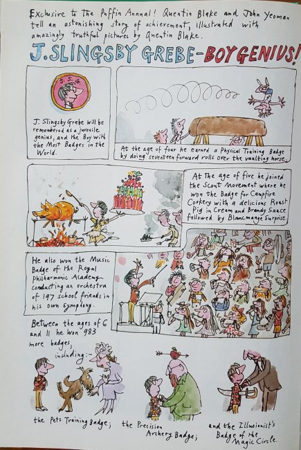 There are a couple of single page ‘introduce the author’ articles and of course lots of artwork by that stalwart of the original magazines, and favourite children’s illustrator, Quentin Blake, who drew the fun end papers which are also the index and also provided pictures for the story of J. Slingsby Grebe – Boy Genius.