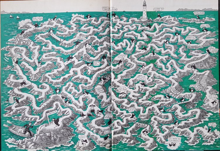 I’ll leave you with the very last item in Puffin’s Pleasure, a maze printed on the endpapers, see if you can get the lighthouse keeper from his rowing boat to the lighthouse, have fun.
