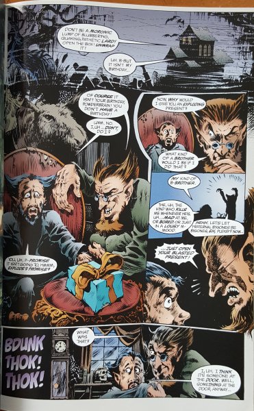 The page below is from the final comic in this volume, The Sandman now has his power restored and so his initial quest is complete. The resolution has come as an anticlimax and what he doesn’t know now is what to do next so is reduced to just sitting, feeding the pigeons in a park until his sister arrives to try to shake him out of his deep reverie. As you can see the artwork is very different in this comic which is effectively a codicil to the first seven, I actually enjoyed this episode more than those before it and this is the first slight hint of the existence of The Endless a group of seven siblings who are like gods (although there is no specific reference to the family this early on in The Sandman series). In the final panel of this comic, and the book, you see that The Sandman is back.