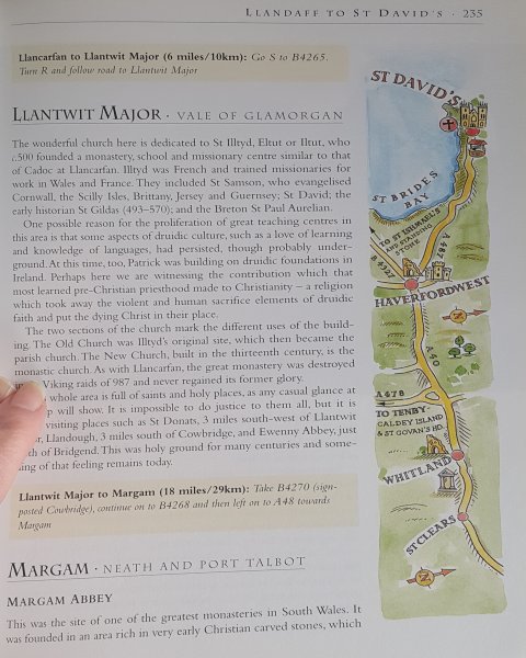 The example above shows what I mean, this is a journey TO St David’s and if you are going to ignore geographic orientation, north is to the right on this panel, then at least work down the picture to the destination not up. Also as you can see the text doesn’t actually refer to the map on the page, in fact that part of the journey is eight or nine pages further on, where there is no map but could easily have been one. The whole page layout throughout the book is as confusing as the selection of routes, you find yourself either inserting lots of bookmarks or constantly flipping between pages in an attempt to follow what is going on.