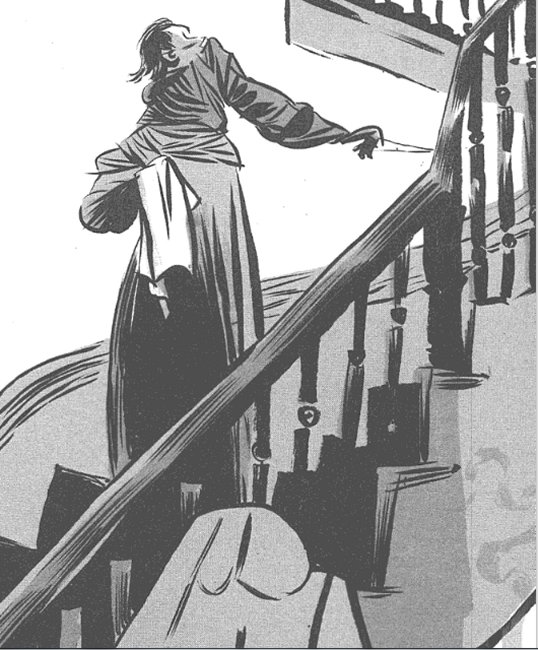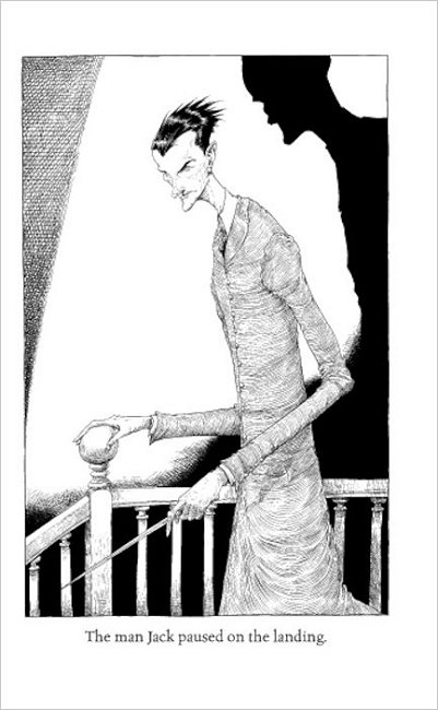 Master story teller of dark tales Neil Gaiman produced another brilliant book for young adults back in 2008 and my Bloomsbury edition is beautifully illustrated by Chris Riddell. Gaiman is probably best known for his books Coraline and Stardust both of which were turned into wonderfully strange films, along with the comic novel masterpiece that is Sandman and his collaboration with Terry Pratchett in writing Good Omens. The American edition, also released in 2008 was illustrated by Dave McKean who also did all the covers for the Sandman graphic novels and this version contains far more illustrations than the UK edition but I really like the sparseness of the Riddell pictures, see the two examples below. The darkness of the novel starts right from page one where before we get to the bottom of the page our hero’s entire family, mother, father and elder sister have been murdered by the man Jack and he is going up the stairs to kill him who is just eighteen months old. First is the picture by Chris Riddell and then comes part of the image of the same scene by Dave McKean.