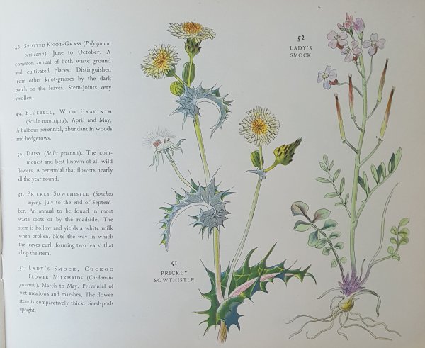 Written and illustrated by Chadwick this is the first edition printed April 1949 and it was reprinted a further four times making it the most reprinted of the four Paxton Chadwick Puffin Picture Books. As soon as you open the book it is clear why it was so popular, unlike any other Puffin Picture Book this one is almost full colour throughout (pages 2 and 3 which describe the structure of a flower are in black and white), normally half the illustrations would be in black and white and the pictures are beautiful. I particularly like the double page centre spread comparing a Great Mullein and a Foxglove see above. In total there are sixty one different plants illustrated and described giving their flowering season and if they are annual, biennial or perennial species. You also get the common English name along with the Latin and some more information as to how to identify the plant making it the best reference work on British wild flowers published by Penguin up to that point and not superseded until John Hutchinson and Edgar Hahnewald’s Wild Flowers in Colour was published by them in April 1958 which covered five hundred species.