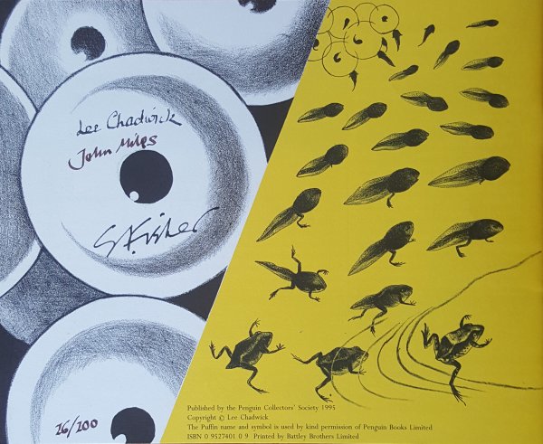 Written and illustrated by Chadwick this book was to be his final work as he died during its production which had started back in 1958 and was nearly complete by his death. Just how complete would become clear when the Penguin Collectors Society approached his widow, Lee Chadwick in the early 1990’s to see what, if anything, still survived. The final agreed text was known to exist in Bristol University archives and Lee confirmed that the plates were at The London College of Printing and when checked were found to be in excellent condition but needing some work before they could be used. This preparation of the plates was done by Sheila Fisher (nee Dorrell) who had been at the Manchester School of Art in the 1930’s when Chadwick had worked there and after the war became his assistant. However there was a further problem, the book needed to be properly designed and typeset in as sympathetic way as possible to the original 1960’s plans and here John Miles stepped in, he had been employed by Penguin back in the 1950’s as assistant to the head designer Hans Schmoller. By getting this remarkable group of people together, all of whom were in their seventies or eighties including Lee Chadwick to do some final editing the book was finally printed March 1996, some thirty five years after it had originally planned to be issued. There were just a thousand copies printed, the first one hundred of which were signed by Lee Chadwick, John Miles and Sheila Fisher. Penguin Books agreed to the edition having the original PP116 number assigned back in 1961. The book came with a twelve page booklet by Steve Hare entitled ‘The Life History of Life Histories’ which details the long gestation of this project and reprints sections of letters between Penguin Books and Paxton Chadwick regarding the work he was doing.