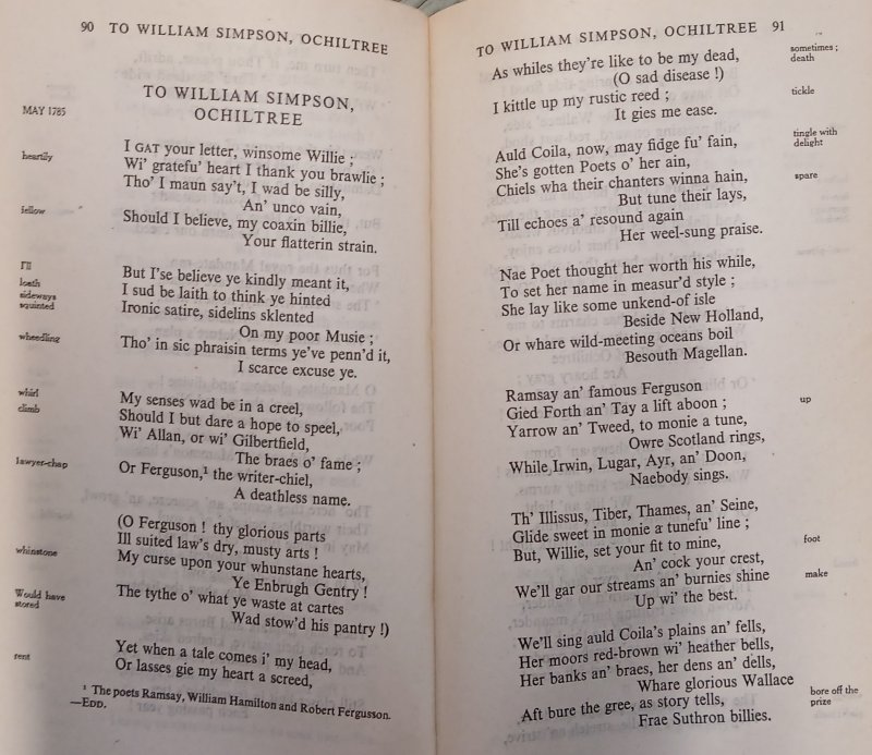 Scotch bear is barley and Burns is of course talking about whisky, the full twenty one verses of the poem can be read here, let no-one say that Burns wasn’t keen to celebrate his national drink. When I first started to read this book for this blog I did have some problems with the unfamiliar Scots dialect but as I progressed through the works I gradually found it easier to understand and found I needed to refer back to the glossary less and less. Interestingly when I have heard Burns recited I have often had far fewer issues with understanding, I guess this is similar to the way I find reading Middle English easier if I read it aloud and it then seems to make more sense than just reading silently.