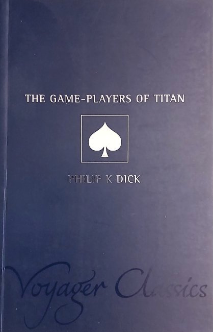 Voyager Classics was a relatively short lived series of science fiction and fantasy books from Harper Collins all with the same blue and silver cover design, with French flaps and a different small, but sort of appropriate, image in the box on the front along with the spine. In this case the ace of spades even though the game they play in the book, Bluff, is clearly a board game. At the time of writing Harper Collins still list two titles in this series on their website, however only one of these has this rather attractive cover design. The Game-Players of Titan is book ten of the thirty six listed titles at the start of the book and they must have all been released, or at least announced, simultaneously in 2001 as this is the first edition. The initial set includes the three Lord of the Rings novels along with The Silmarillion making Tolkien the most represented author, but Ray Bradbury, Stephen Donaldson, David Eddings and Kim Stanley Robinson each appear three times. Philip K Dick has one other titles in the first thirty six, ‘Counter-Clock World’.