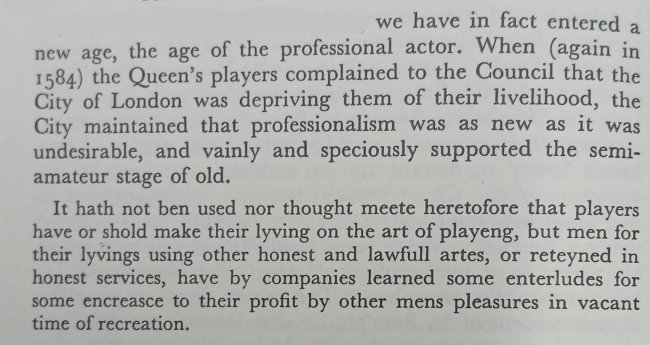 The period starts with the tail end of the countrywide performances of religious Mystery and Passion plays which had started as instruction to the populace centuries earlier (think of the still performed decennial Oberammergau Passion Play for a modern example) and leads us through the development of other subjects beyond religion becoming the basis of performances both comedy and tragedy along with the first appearance in England of professional actors. In 1485 there were no companies of players, plays were normally performed by children, often cathedral choristers or pupils of the Grammar schools, which would be given at the royal court or in their own halls. For adult performances there would be plays by teachers at the universities (primarily Oxford and Cambridge) and oddly by members of the four Inns of Court, presumably due to the eloquence of professors and barristers. Indeed members of both the Inner Temple and Middle Temple are referred to many times throughout the book as performing plays especially at Christmas. No dedicated theatre as such existed in England until the last decade or so covered by this book and it was only then that adult actors started to outnumber child performers and professionalism began to gain ground.