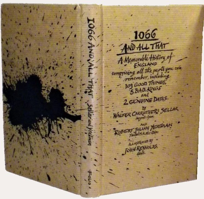 1066 and All That is a 20th century classic piece of humour written by two people who although they worked together many times afterwards never achieved the level of success of this, their first book, ever again. Walter Sellar was a school teacher at various private schools in England including his old alma mater Fettes College and ending up at the highly prestigious Charterhouse. Appropriately he originally taught history although later on switched to English, he also wrote humorous pieces for Punch magazine as did Robert Yeatman although the two originally met at Oriel College, Oxford after the First World War. Yeatman came from a relatively prosperous family involved in importing Port wine in connection with Taylor’s Port but largely worked as an advertising copywriter and executive for such businesses as Kodak. The introduction of this Folio Society edition was written by broadcaster and stage director Ned Sherrin and very informative it is too, as it has anecdotes from several people who knew both men including Yeatman’s son Bill who recalls that his father had a sign on the gate CAVE CANEM (Latin for Beware of the Dog) when someone pointed out that burglars wouldn’t understand the notice he replied “Then they are not the sort of burglars we want.” I think this gives a good insight into the humour that you will encounter on reading the book.