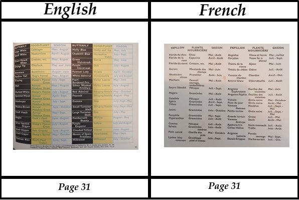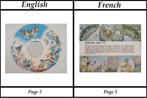 Two pages within this book are completely changed with totally new designs. The first one makes sense to change as the French text appears to be significantly longer than the English and therefore difficult to fit into the circular gap. The second one is less obvious why it was altered to a much more scientific form.