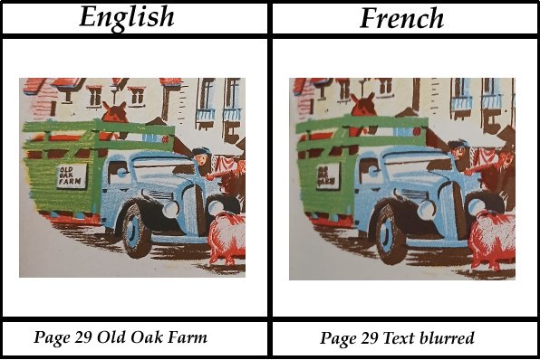 The other change is not included in the checklist and it is the amendment to the sign on the side of the lorry on the page dealing with going to the market, where the English text has simply been blurred out.
