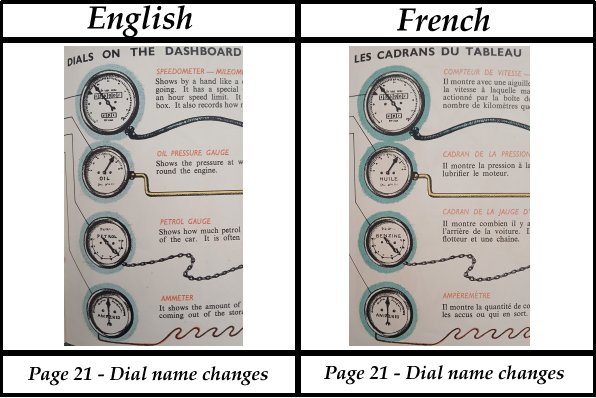 The two small changes to this book are so small that they were ignored by the checklist, the first one is quite amusing and is a text alteration on the middle page spread where in the English version after the word chassis it points out that this is a French word, quite rightly the French edition doesn’t bother with this explanation. The other change is shown below and is an amendment to the text on the gauges.