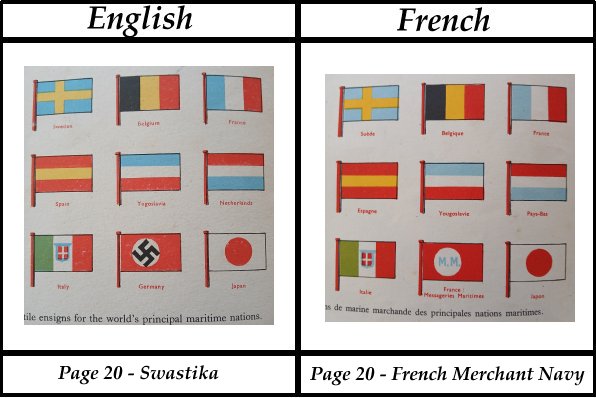 The very next page has the British naval flag, the Red Ensign, altered to be unrecognisable in the French version. This also occurs on page 24 but I’ve just included the one example here.